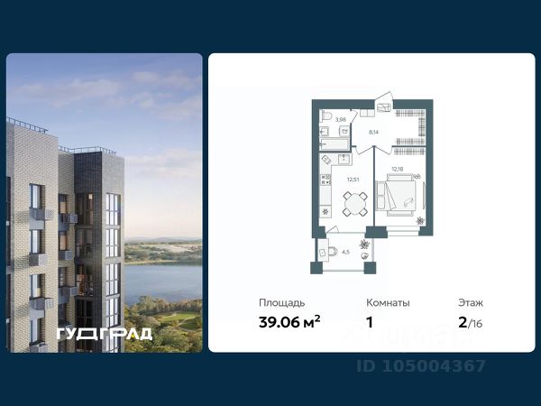 Квартира на 17 этаже 19 этажного, кирпичного дома, общая площадь 50,2 м2, кухня 14,5 м2 и комната 20, м2, высота потолков 3 м, без балкона.