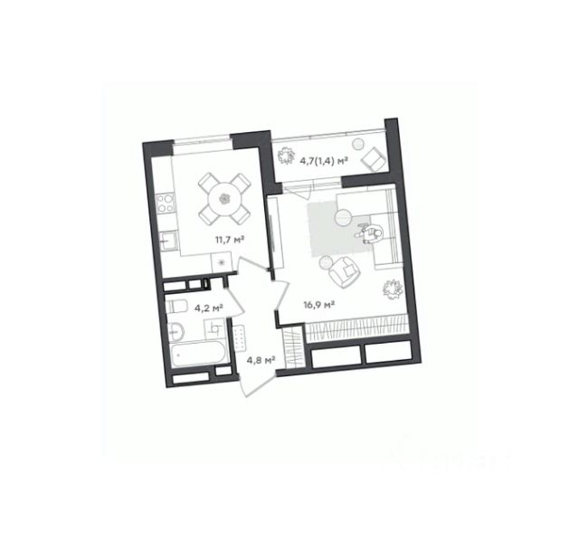 Квартира для свободных и независимых Просторная кухня-гостиная для неспешных завтраков и шумных встреч с друзьями. Площадь кухни 11,7 кв.м позволяет совмещать досуг и работу на одном пространстве. Компактная спальня 16,9 кв. м с выделенными зонами для работы и отдыха. Выход на балкон 4,7 кв. м - идеальное место для чтения книги или любования закатом Вместительный коридор 4,8 кв.м с выделенным местом под шкаф-купе, который так нужен каждой моднице В ванной комнате 4,2 кв.м предусмотрено место под стиральную машину