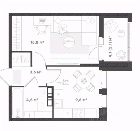 Функциональность и ничего лишнего Оптимально для молодой семьи, холостяков и семьи, у которой дети выросли и живут отдельно. Уютная кухня, просторная комната с нишей под шкаф и выходом на лоджию, в котором можно обустроить кабинет или зону отдыха. Прихожая с нишей под шкаф-купе Совмещенный санузел.