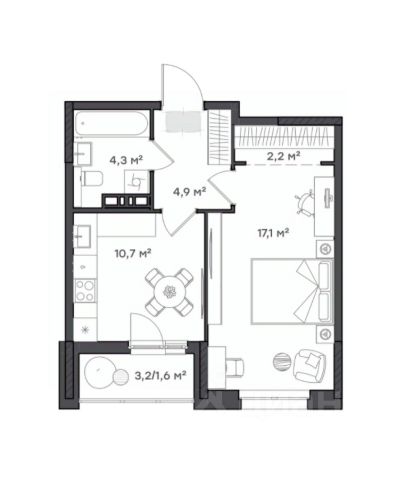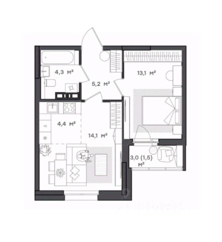 Больше, чем однокомнатная При входе в квартиру вы попадаете в просторный коридор с выделенной нишей под шкаф для одежды. Кухня гостиная разделена на две зоны: ниша под кухонный гарнитур и обеденная зона с местом для отдыха. Балкон 4,5 кв.м можно оборудовать для дополнительного места для релакса. Уютная спальня 12,8 кв.м правильной формы позволит создать идеальный интерьер Ванная комната с выделенной нишей под стиральную машину.