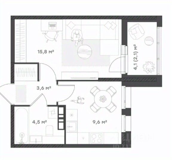 Идеально для небольшой семьи Оптимальная планировка 1+ для молодой семьи, холостяка или семьи, у которой дети выросли и живут отдельно. Просторная кухня-гостиная с удачным зонированием и выходом на лоджию, где можно обустроить дополнительную зону отдыха. Спальня с местом под гардероб. Прихожая с нишей под шкаф-купе Совмещенный санузел.