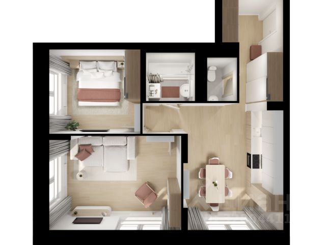 - жилая площадь 28,22 кв.м: спальня 12,04 кв.м и гостиная/детская 16,18 кв.м;