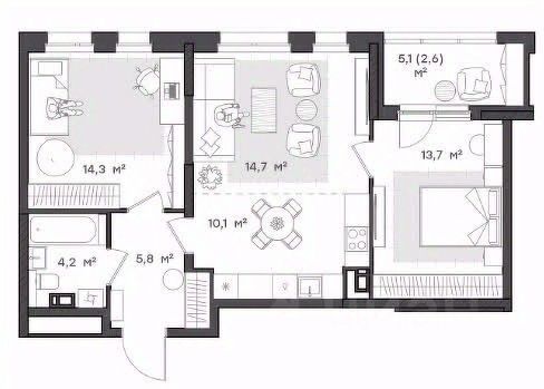 Семейная квартира формата 2+ Просторная квартира с прихожей почти 10 кв.м. Функциональная кухня-гостиная. Две спальни, окна которых выходят на разные стороны света. В одной из спален есть своя лоджия, где можно обустроить дополнительную зону отдыха. Раздельный санузел.