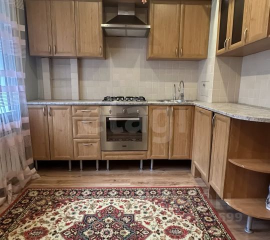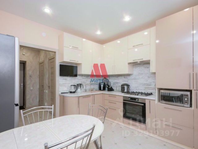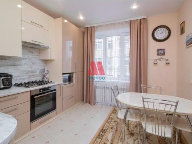 Кухня порадует встроенным гарнитуром: низ выполнен из тёмно-серого матового пластика, верх - из светло-серого матового, профиль "Гола". Установлен трёхступенчатый фильтр питьевой воды, каменная мойка и сантехника. Встроенная бытовая техника включает индукционную варочную панель, духовой шкаф, посудомойку, вытяжку ("Krona", Турция), холодильник, стирально-сушильную машину Indesit, микроволновку и TV LG с классом энергосбережения ААА - всё новое. Материал штор и стульев - велюр. Предусмотрено четыре зоны