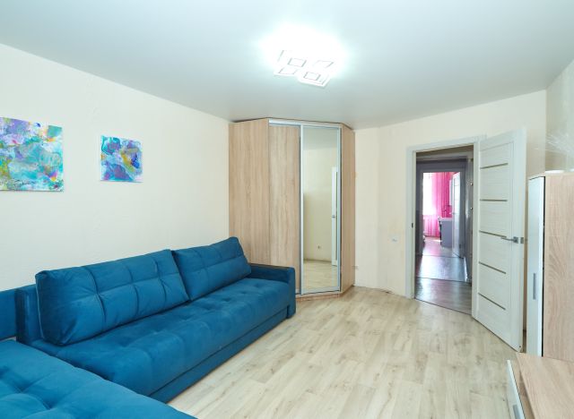 В гостиной вас встретит комфортный диван с механизмом "книжка" насыщенного изумрудного цвета - обивка из велюра, спальное место размером 200145 см. Светлая рабочая зона у окна будет удобна как при дневном, так и при искусственном освещении - столешница из износостойкого пластика размером 140300 см позволит комфортно разместиться вдвоём. Розетки, интернет и HDMI-кабели проложены под столом, есть выдвижные шкафы с доводчиками, электроштора blackout с дистанционным управлением и люстра с множеством режимов работы и отдельным пультом. Также в гостиной установлена минималистичная стенка с подсветкой и стеклянными витринами.