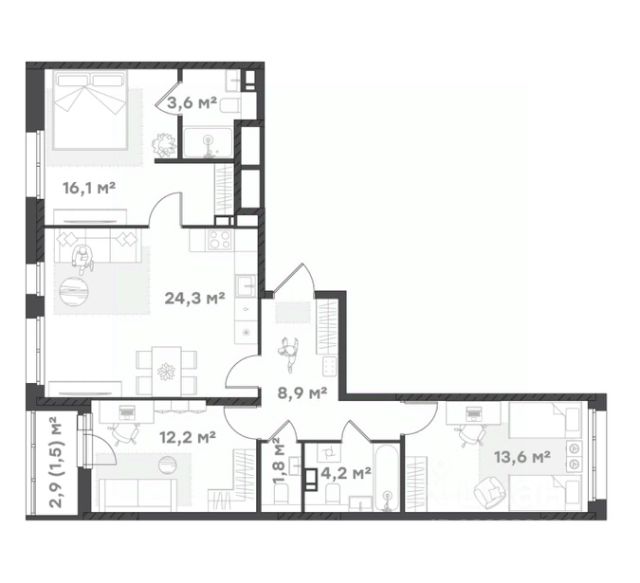 Cемейные резиденции Трехкомнатная квартира для ценителей семейных ценностей Просторная кухня 13,5 кв. м с местом под кухонный гарнитур и выходом на балкон 3,5 кв.м. Площадь кухни позволяет объединить обеденное пространство и зону отдыха Родительская спальня 14,2 кв. м расположена слева от кухни и станет прекрасным местом для отдыха после тяжелого трудового дня Комната для старшего ребенка 18,4 кв.м достаточно просторная чтобы разделить площадь на зону работы и отдыха Спальня 13,4 кв.м с выходом на балкон 3,9 кв. м может стать гостевой комнатой или еще одной детской Два санузла по достоинству оценят все члены большой семьи. Не нужно никого ждать и поторапливать, собираясь утром на работу Огромный коридор 13, 2 кв. м с местом под шкаф-купе гостеприимно вместит ваших гостей и домочадцев