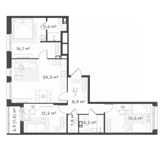Большая семейная квартира Оптимальная планировка для большой семьи. Прихожая с местом под шкаф-купе и отдельной зоной для гардероба или хранения. Большая, функциональная кухня-гостиная с выходом на лоджию, где можно обустроить дополнительную зону отдыха. Просторная мастер-спальня с собственным санузлом и две уютных комнаты. Второй санузел сомещенный.