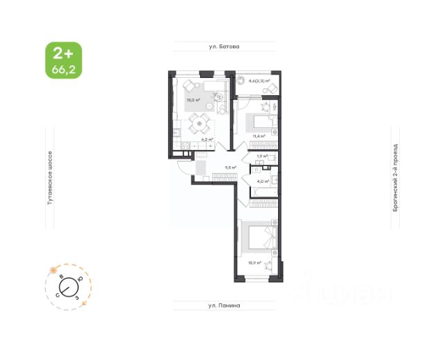 Классическая двухкомнатная При входе в квартиру вы попадаете в просторный коридор, где уже предусмотрено место под шкаф для ваших вещей. Кухня гостиная разделена на две части: ниша под кухонный гарнитур и столовую зона. Спальня 11, 4 кв.м разделена на зоны работы и отдыха. Выход на собственный балкон 4,6 кв.м, который можно обустроить под дополнительную зону релакса. Родительская спальня 15,9 кв.м с правильной прямоугольной формой позволит создать здесь идеальный интерьер.