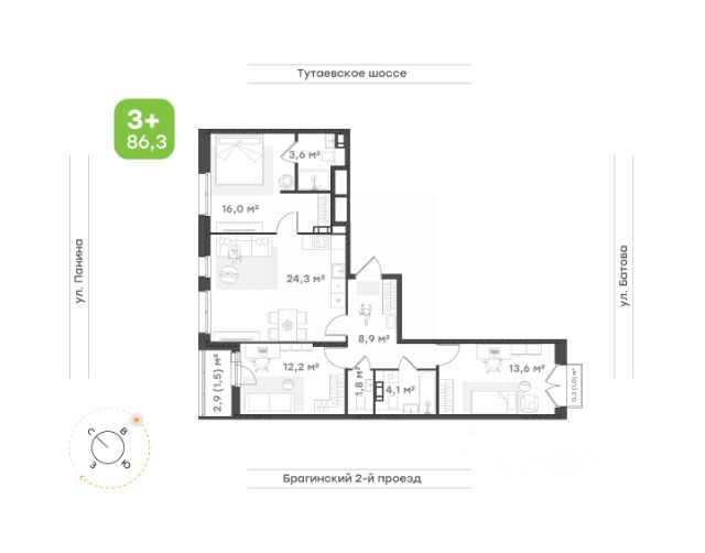 Семейная квартира формата 3+ Оптимальная планировка для большой семьи. Прихожая с местом под шкаф-купе. Большая, функциональная кухня-гостиная, где соберется вся семья. Просторная мастер-спальня с собственным санузлом и зоной под шкаф купе. Две уютных комнаты, одна из которых имеет выход на собственную лоджию. Комнаты выходят на разные стороны света. Раздельный санузел.