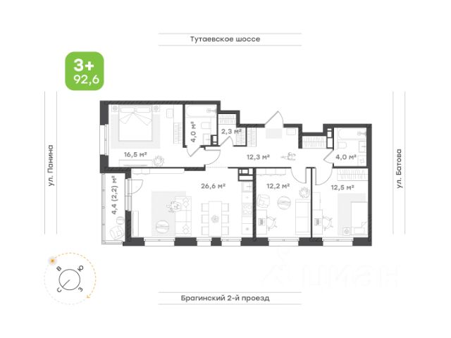 Семейная квартира формата 3+ Оптимальная планировка для большой семьи. Прихожая с местом под шкаф-купе. Большая, функциональная кухня-гостиная, где соберется вся семья. Просторная мастер-спальня с собственным санузлом и зоной под шкаф купе. Две уютных комнаты, одна из которых имеет выход на собственную лоджию. Комнаты выходят на разные стороны света. Раздельный санузел.