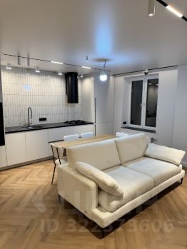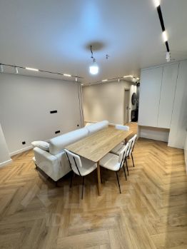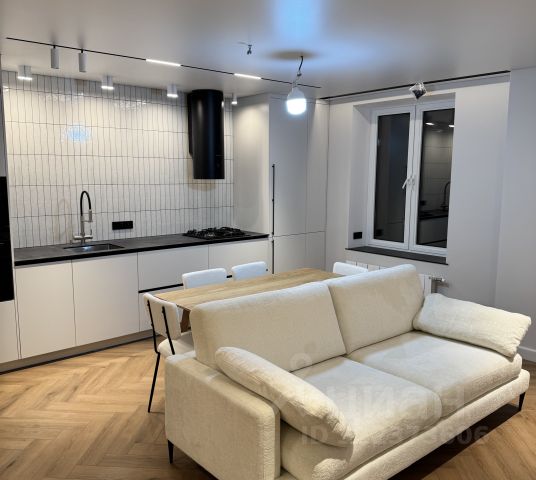 гостиная-кухня , с продуманной эргономикой, удобным диваном. Стол, стулья, дизайнерская тумба, телевизор;