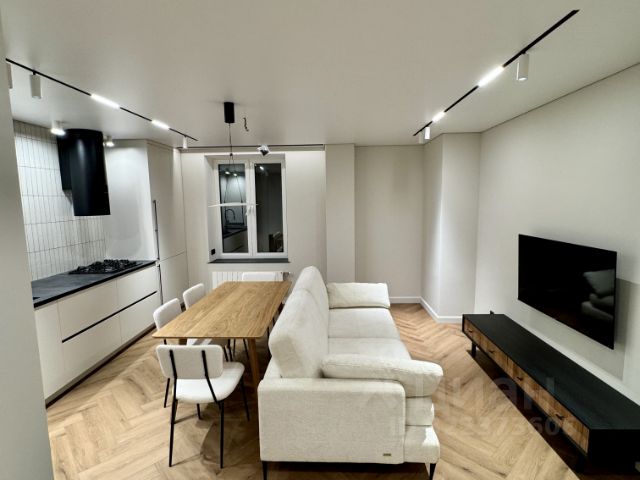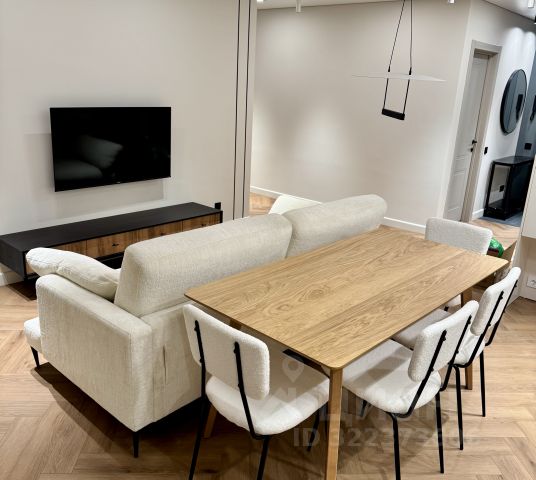 гостиная-кухня , с продуманной эргономикой, удобным диваном. Стол, стулья, дизайнерская тумба, телевизор;