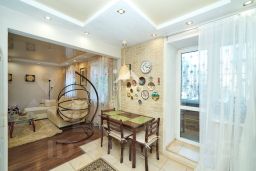 гостиная-кухня , с продуманной эргономикой, удобным диваном. Стол, стулья, дизайнерская тумба, телевизор;