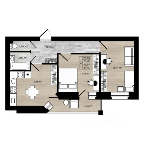 Квартира для тех, кто любит уникальность При входе в квартиру вы попадаете в продуманную прихожую, в которой предусмотрены ниши под установку двух шкафов - купе, в которых можно спрятать не только верхнюю одежду, но и бытовую технику. Наличие небольшой гардеробной в коридоре увеличивает количество мест для хранения Первое, что бросается в глаза это огромная кухня гостиная площадью 25,7 и кв.м с выделенной нишей под кухонный гарнитур, обеленную зону и зону отдыха. Спальня 13,5 кв.м визуально делится на рабочую зону и зону отдыха. А собственный балконом 5,1 кв.м позволяет обустроить дополнительное место для релакса. Вторая спальня 11,3 кв.м оборудована небольшой гардеробной комнатой, а собственный балкон также можно оборудовать под дополнительное место для отдыха. Родительская мастер - спальня 14,7 кв.м с собственной гардеробной и ванной комнатой создаёт атмосферу приватности и уединенности. Гостевая комната 12,5 кв.м также разделена на рабочую и зону отдыха Ванная комната 5,1 кв.м в которой предусмотрено м