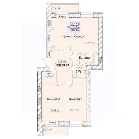 Общая площадь квартиры - 80,2 кв.м, жилая - 47,9 кв.м: (гостиная)16,9+12,1(спальня)+18,9 (детская)кв.м, кухня - 14 кв.м.