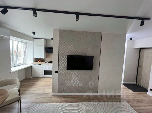 В гостиной вас встретит комфортный диван с механизмом "книжка" насыщенного изумрудного цвета - обивка из велюра, спальное место размером 200145 см. Светлая рабочая зона у окна будет удобна как при дневном, так и при искусственном освещении - столешница из износостойкого пластика размером 140300 см позволит комфортно разместиться вдвоём. Розетки, интернет и HDMI-кабели проложены под столом, есть выдвижные шкафы с доводчиками, электроштора blackout с дистанционным управлением и люстра с множеством режимов работы и отдельным пультом. Также в гостиной установлена минималистичная стенка с подсветкой и стеклянными витринами.