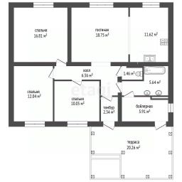 1-й этаж: гостиная 38,3 кв.м, кухня 10,7 кв.м., подсобное помещение, раздельный с/у, 2-й этаж: три комнаты ( 11 кв.м., 19 кв.м, 15,7 кв.м.), с/у раздельный, балкон, сауна.