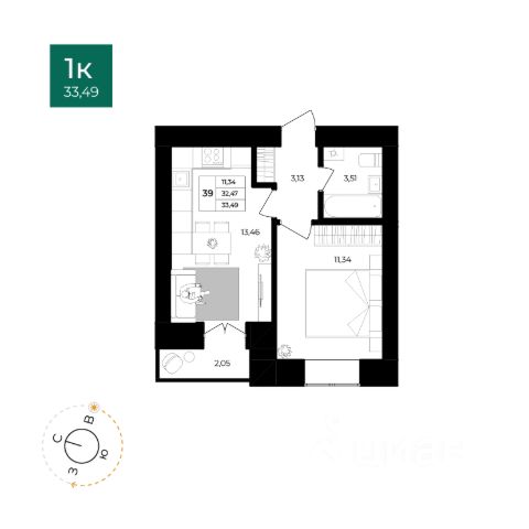 Площадь: 37,15 м² (жилая комната 18,5 м², кухня 10 м², санузел 3,3 м², коридор 4 м²).