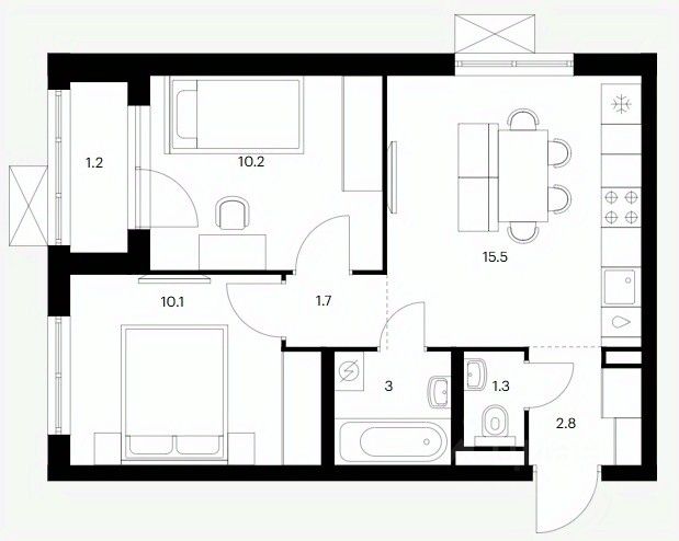 Балкон из спальни - 4,2 кв.м, застеклён, длинный коридор - 9,1 кв.м, коридор между спальней и детской - 3,2 кв.м, ванная комната - 3,7 кв.м, туалет - 1,4 кв.м.
