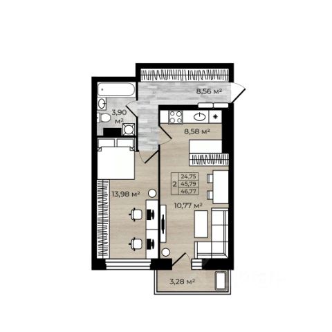 - жилая площадь 28,22 кв.м: спальня 12,04 кв.м и гостиная/детская 16,18 кв.м;