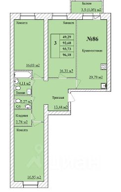 Продаётся 3-комнатная квартира в строящемся доме (Строение 1 (2 этап)), срок сдачи: IV-кв. 2026, общей площадью 93.73 кв.м., на 7 этаже.