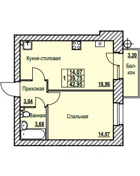 Европейская однокомнатная Современная кухня-гостиная 19,4 кв. м с выделенной нишей под кухонный гарнитур и выходом на балкон . Развивайте здесь свои кулинарные навыки и встречайте гостей Уютная спальня 14, 1 кв. м станет местом отдыха и восстановления после трудового дня. Просторная ванная комната 4,3 кв. м с уже предусмотренным местом под стиральную машину Небольшой коридор 5,1 кв. м с местом под шкаф-купе для вашей верхней одежды