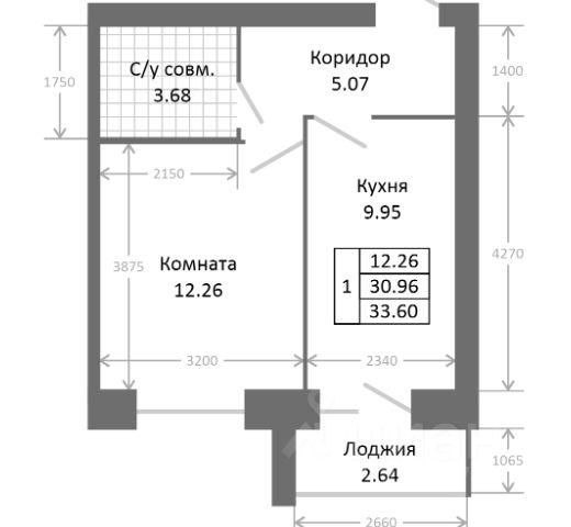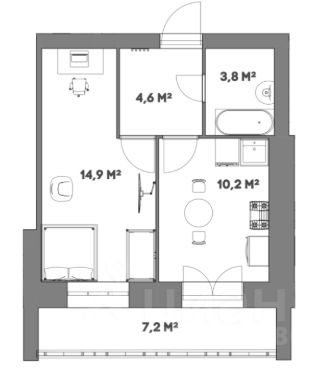 Площадь: 37,15 м² (жилая комната 18,5 м², кухня 10 м², санузел 3,3 м², коридор 4 м²).