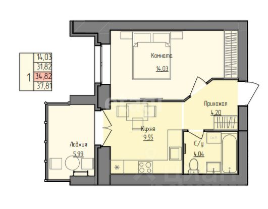 Общая площадь квартиры - 30,6 м, из которых 10,5 м приходится на жилую площадь, а 18 м - на просторную кухню-гостиную. Такая планировка позволит с удобством разместить необходимую мебель и создать функциональное пространство для приготовления пищи и семейных ужинов.