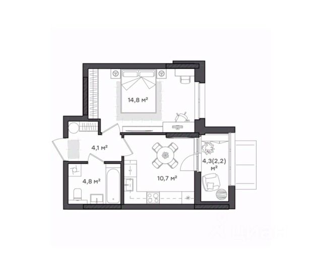 Функциональность и ничего лишнего Оптимально для молодой семьи, холостяков и семьи, у которой дети выросли и живут отдельно. Уютная кухня, просторная комната с нишей под шкаф и выходом на лоджию, в котором можно обустроить кабинет или зону отдыха. Прихожая с нишей под шкаф-купе Совмещенный санузел.