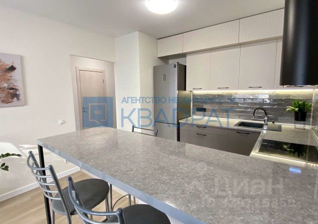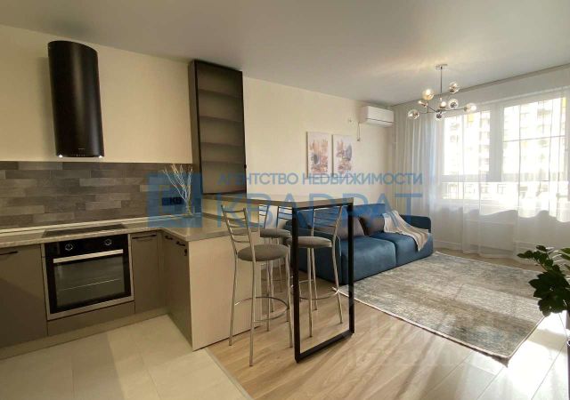 В квартире выполнен ремонт в приятных тонах, на полу ламинат, обои под покраску, потолок натяжной. Огромная кухня-гостиная 21,5 м2, остается кухонный гарнитур, бытовая техника: варочная поверхность, духовой шкаф, посудомоечная машина Siemens, вытяжка, холодильник Samsung, диван, ТВ-тумба. Спальня 14,5 м2, остается кровать с подъемным механизмом, матрас, шкаф-купе. С/узел в керамической плитке, остается стиральная машина Bosch. Также в подарок остаются гармонично подобранные шторы.