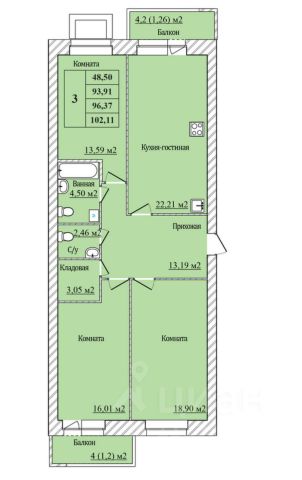 Продаётся 3-комнатная квартира в строящемся доме (дом 7), срок сдачи: II-кв. 2026, общей площадью 96.37 кв.м., на 8 этаже.