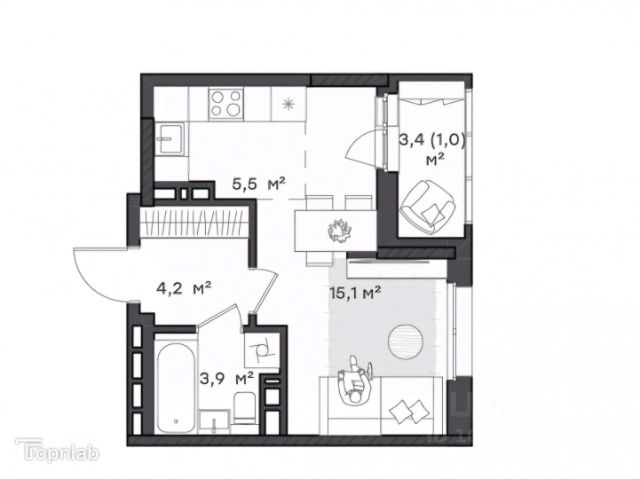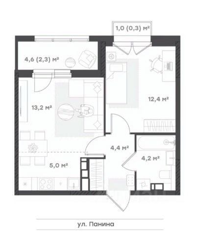 Функциональная студия Отлично зонированная квартира для молодой семьи или холостяков. Прихожая с нишей под шкаф-купе. Кухонная зона с выходом на лоджию, где можно организовать зону отдыха. Комната 12,7 кв.м. Совмещенный санузел.