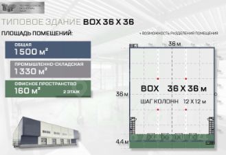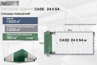 Пpoизводственно-складская зона: 1340 кв.м., офисная зона: 160 кв.м.
