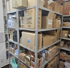 2) Полностью оборудованный стеллажами склад =7 кв.м., стеллажи под потолок, с нагрузкой на одну полку стеллажа до 150 кг.