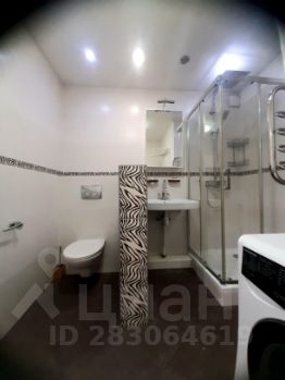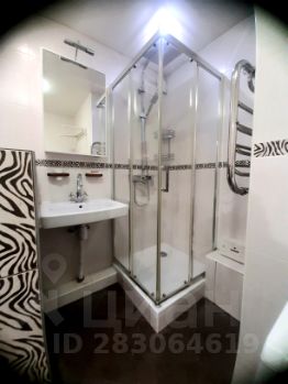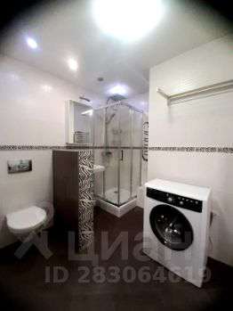 большой совмещённый санузел оборудованный душевой кабиной и стиральной машиной.