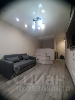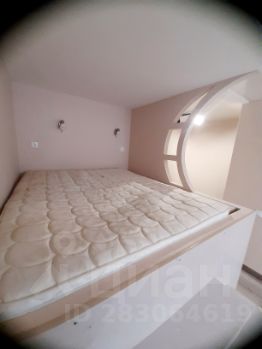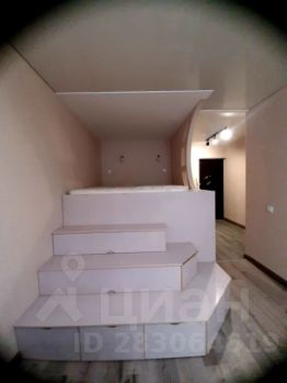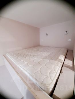 комната с диваном , телевизор и двуспальная кровать в виде подиума с множеством мест хранения