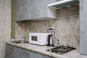 Оснащенная кухня техникой и посудой.