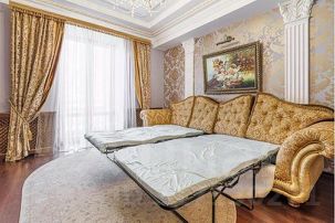 Двуспальная кровать (180*200) в спальне, раскладной диван в зале ( раскладывается на 2 отдельных спальных места) с комплектами нежного, качественного постельного белья, подарят комфортный сон.