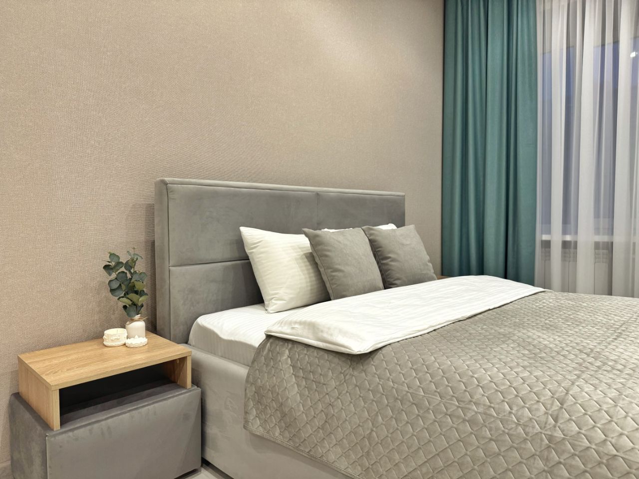 • Просторная спальня: Уютная двуспальная кровать для безмятежного сна, телевизор и вместительный шкаф .