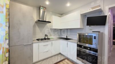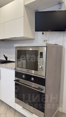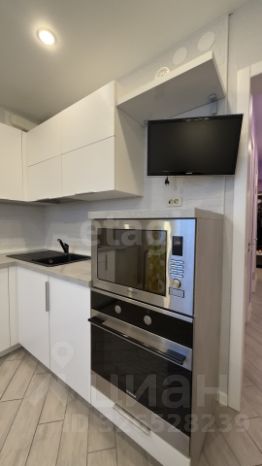 Кухня: Функциональное пространство с холодильником, духовым шкафом, микроволновой печью, телевизором и стильной подсветкой. Посудомоечной машины нет.