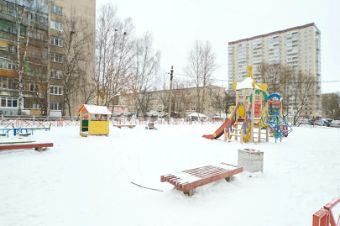 Во дворе детская площадка, рядом магазин Магнит .