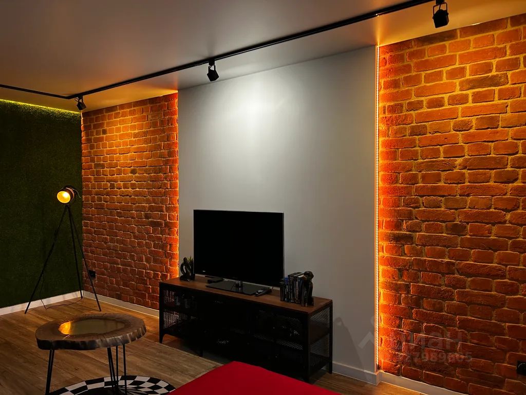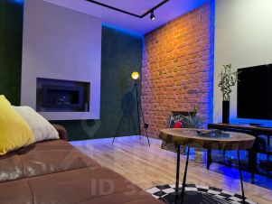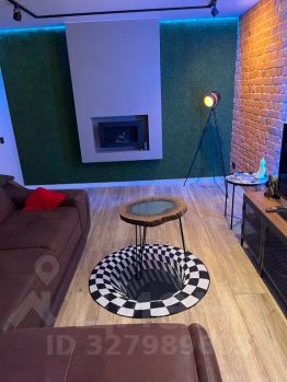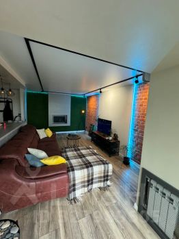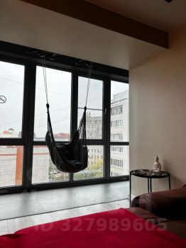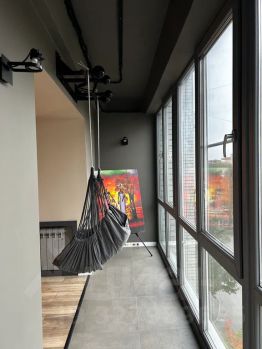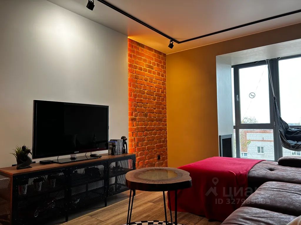 В гостиной есть раздвижной диван, телевизор с подпиской на wink, ps4 с игровыми дисками, умная колонка "Алиса", подсветка, турник и подвесная качель у панорамных окон.
