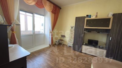 Комната разделена на две зоны: входная зона с кухонным гарнитуром, и отдельная зона для отдыха и сна с выходом на балкон.
