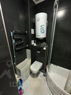 Просторная ванная. Всё по уму: стиральная машина, водонагреватель, зеркало с подсветкой, удобный пенал для хранения, полки, крючки. Все продумано до мелочей