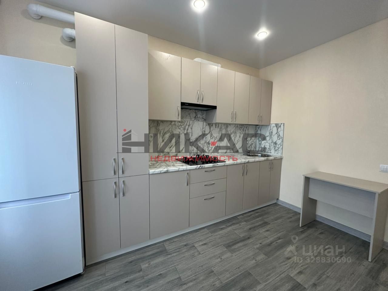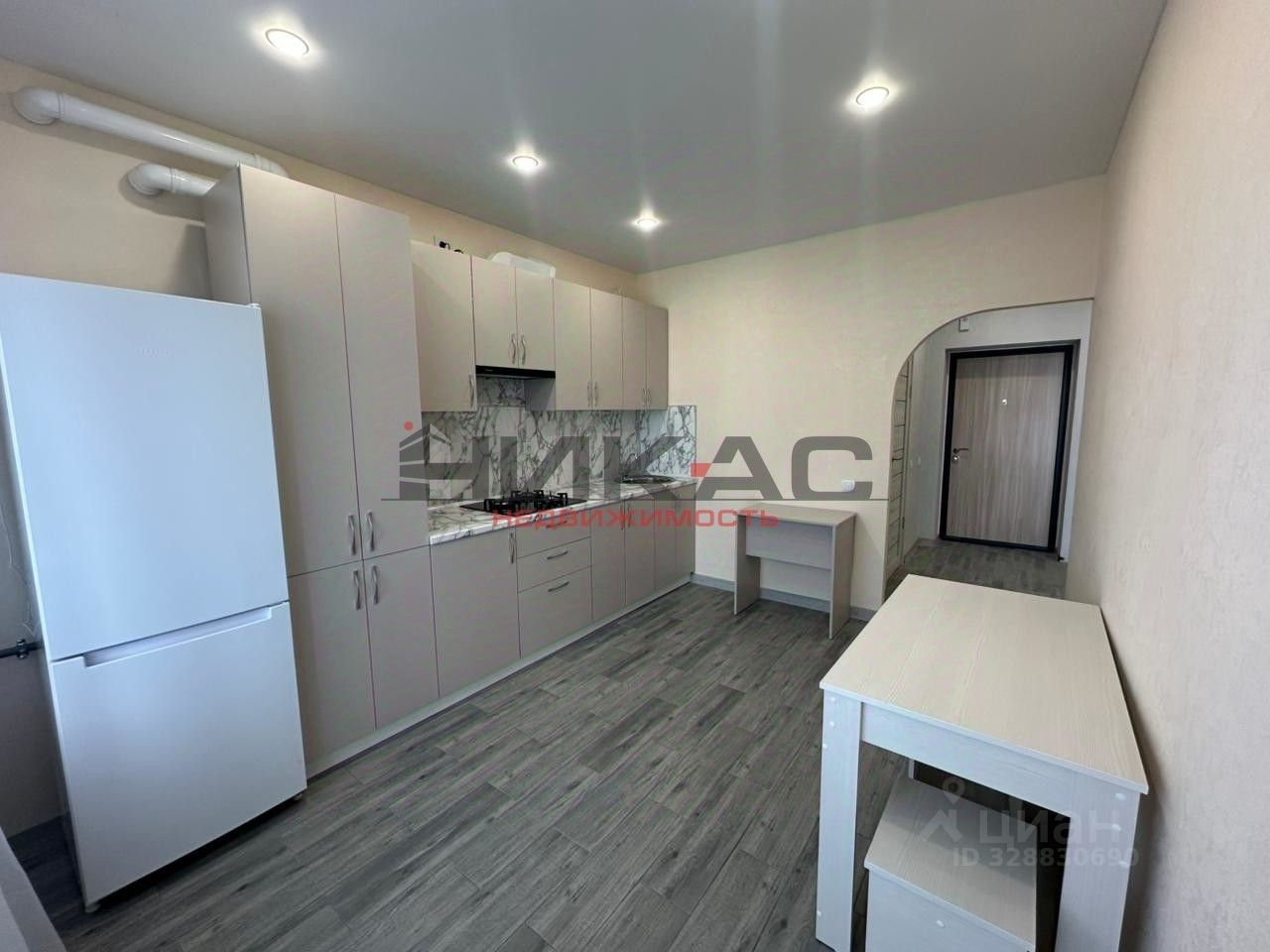 Встроенный кухонный гарнитур, варочная поверхность, вытяжка, холодильник, обеденная группа (стол, стулья).