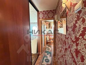 В прихожей большое зеркало, шкафчик, полки для хранения обуви.