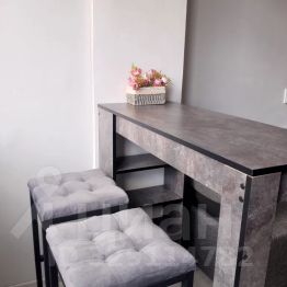 В кухонной зоне барный стол и два барных стула. Из окна открывается красивый вид на небо.