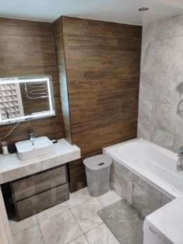 Полный комплект бытовой техники: телевизор, холодильник, варочная поверхность, вытяжка, духовой шкаф, микроволновка, стиральная машина, утюг, гладильная доска, сушилка