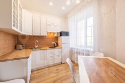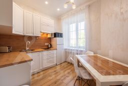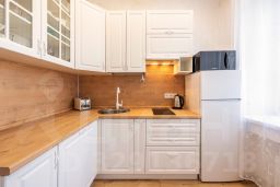Удобная укомплектованная кухня с обеденной зоной: холодильник, микроволновая печь, варочная панель, электрический чайник, тостер, электрическая турка, кулер с водой, кухонный гарнитур, набор столовой посуды и посуда для приготовления пищи, посудомоечная машина. Гостям предлагается чай, кофе, сахар.