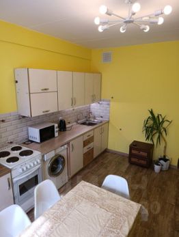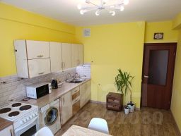 В квартире есть набор всей необходимой минимальной мебели и техники: два дивана, шкаф для одежды, стенка для хранения вещей, кухонный гарнитур, обеденный стол со стульями, телевизор, холодильник, стиральная машина, микроволновка, электрический чайник, электрический накопительный водонагреватель.